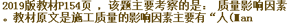 该题主要考察的是: 质量影响因素。教材原文是施工质量的影响因素主要有“人(Man)、材料(Material)、机械(Ma-chine)、方法(Method)及环境(Environment)”等五大方面,即4MIE。“如何调直钢筋”显然不属于人和环境因素,应注意它属于施工方法的问题,考点不是什么机械的问题。因此,正确选项是C