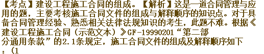 建设工程施工合同的组成。【解析】这是一道合同管理与应用的题,主要考核施工合同文件的组成与解释顺序的知识点。对于具备合同管理经验、熟悉相关法律法规知识的考生,此题不难。根据《建设工程施工合同(示范文本)》GF-19990201“第二部分通用条款”的2.1条规定,施工合同文件的组成及解释顺序如下:(1)施工合同协议书(双方有关的工程洽商、变更等书面协议或文件视为协议书的组成部分);(2)中标通知书;(3)投标书及其附件;(4)施工合同专用条款;(5)施工合同通用条款;(6)标准、规范及有关技术文件;(7)图纸;(8)工程量清单;(9)工程报价单或预算书。施工合同文件各组成部分应能够互相解释、互相说明。当合同文件中出现不一致时,上述顺序就是合同的优先解释顺序。当合同文件出现含糊不清或者当事人有不同理解时,按照合同争议的解决方式处理。由此可见,本题的正确选项应为“B.施工合同协议书、中标通知书、投标书及其附件、施工合同专用条款”。注:《建设工程施工合同(示范文本)》GF—1999—0201已更新为《建设工程施工合同(示范文本)》GF—2013—0201。div style="padding-bottom: 10px; margin-left: 20px; display: block;" id="DivIframe"div style="border: 2px solid rgb(204, 204, 204);"iframe style="width: 730px; height: 300px;" id="IframeC1" src="../../User/appDiscussList.aspx?nType=1&S_Id=239250" frameborder="0"/iframe/div/div