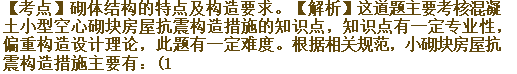 砌体结构的特点及构造要求。【解析】这道题主要考核混凝土小型空心砌块房屋抗震构造措施的知识点,知识点有一定专业性,偏重构造设计理论,此题有一定难度。根据相关规范,小砌块房屋抗震构造措施主要有:(1)小砌块房屋各楼层均应设置现浇钢筋混凝土圈梁,不得采用槽形小砌块作模,并应按规范的有关要求设置。圈梁宽度不应小于190mm,配筋不应少于4φ12,箍筋间距不应大于200mm。现浇或装配整体式钢筋混凝土楼、屋盖与墙体有可靠连接,可不另设圈梁,但楼板沿墙体周边应加强配筋并应与相应的构造柱可靠连接。(2)小砌块房屋墙体交接处或芯柱、构造柱与墙体连接处,应设置拉结钢筋网片,网片可采用直径4mm的钢筋点焊而成,每边伸入墙内不宜小于1m,且沿墙高每隔400mm设置。(3)多层小砌块房屋的层数,6度时超过五层、7度时超过四层、8度时超过三层,在底层和顶层的窗台标高处,沿纵横墙应设置通长的水平现浇钢筋混凝土带;其截面高度不小于60mm,纵筋不应少于2φ10,并应有分布拉结钢筋;其混凝土强度等级不应低于C20。(4)多层小砌块房屋的女儿墙高度超过0.5m时,应增设锚固于顸层圈梁的构造柱或芯柱;墙顶应设置压顶圈梁,其截面高度不应小于60mm,纵向钢筋不应少于2φ10。本题的正确项应为“A.0.50”。