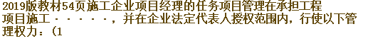1Z201092施工企业项目经理的任务 项目经理在承担工程项目施工管理过程中,履行下列职责: (1)贯彻执行国家和工程所在地政府的有关法律、法规和政策,执行企业的各项管 理制度。 (2)严格财务制度,加强财经管理,正确处理国家、企业与个人的利益关系。 (3)执行项目承包合同中由项目经理负责履行的各项条款。 (4)对工程项目施工进行有效控制,执行有关技术规范和标准,积极推广应用新 技术,确保工程质量和工期,实现安全、文明生产,努力提高经济效益。 项目经理在承担工程项目施.T.的管理过程中,应当按照建筑施工企业与建设单位签订 的工程承包合同,与本企业法定代表人签订项目承包合同,并在企业法定代表人授权范围 内,行使以下管理权力,• (1)组织项目管理班子。 (2)以企业法定代表人的代表身份处理与所承担的工程项目有关的外部关系,受托 签署有关合同。 (3)指挥工程项目建设的生产经营活动,调配并管理进入工程项目的人力、资金、 物资、机械设备等生产要素。 (4)选择施X作业队伍。 (5)进行合理的经济分配。 (6)企业法定代表人授予的其他管理权力o