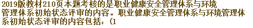 初始状态评审是对组织过去和现在的职业健康安全与环境的信息、状态进行收集、调查分析、识别,获取现行法律法规和其他要求,进行危险源辨识和风险评价、环境因素识